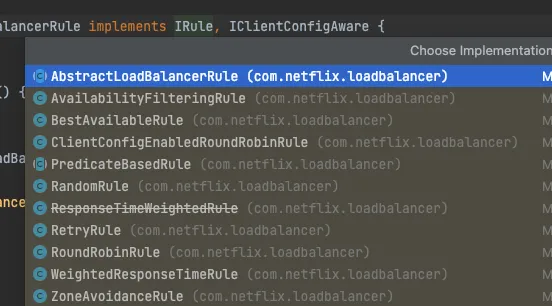 通过查看IRule实现类,可以做其余负载均衡实现方案的更多测试