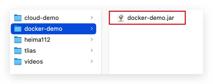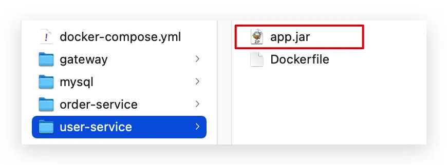 编译打包好的app.jar文件,需要放到Dockerfile的同级目录中。注意:每个微服务的app.jar放到与服务名称对应的目录,别搞错了。