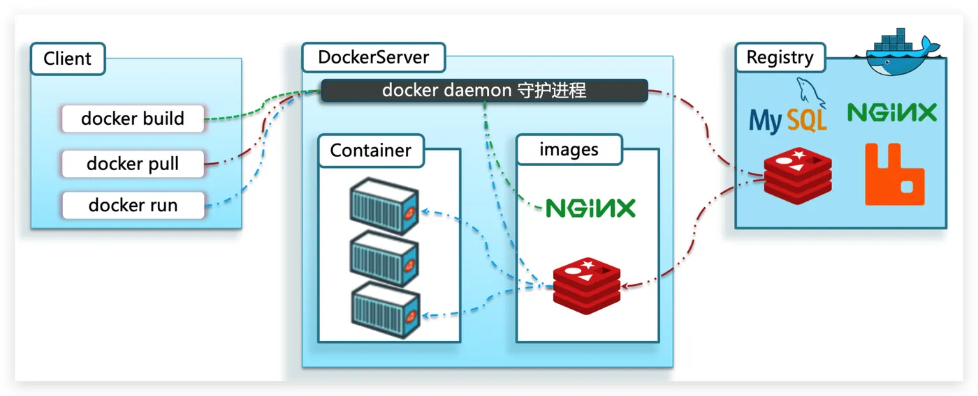 - 服务端(server):Docker守护进程,负责处理Docker指令,管理镜像、容器等