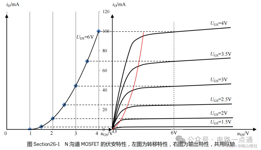 参考下图中的mos管的特性曲线,右图中的输出特性曲线中有一根红色的分界线,这个线就是区分mos管工作状态的分界线,在红线的左边,mos管工作在可变电阻区,也就是线性区;在红线的右边mos管工作在恒流区,也就是饱和区。当然,还有一个截止区。