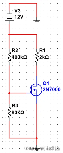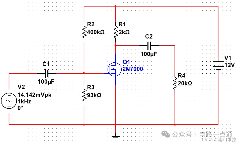 如上图所示,是在multisim中绘制的放大电路,便于仿真验证。使用的MOS管的型号为2N7000。计算中需要使用的关键参数