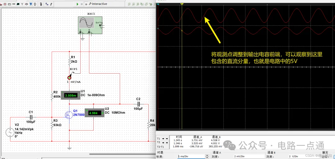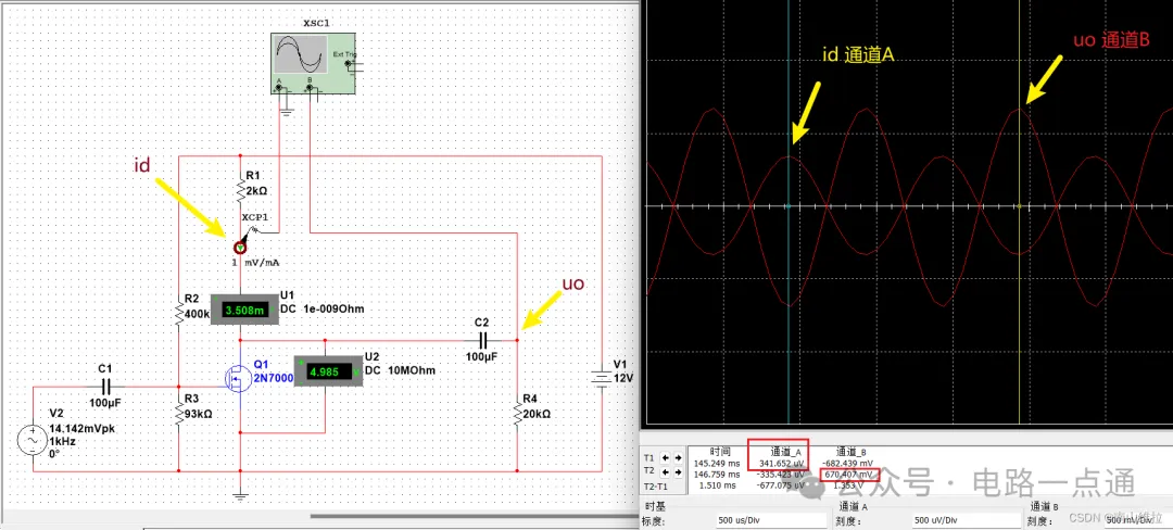 如上图,我们在电路中串入一个直流电流表测量电路中的 I D Q I_{DQ} IDQ;并联一个直流电压表测量 U D S Q U_{DSQ} UDSQ。将两个表测量的值和上面计算出来的值对比发现,结果非常接近,说明计算正确。