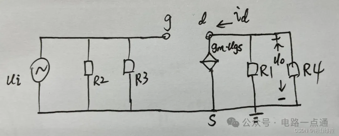 该等效电路是对MOS管模型的等效,等效出一个压控电流源,即 u g s u_{gs} ugs控制 i d i_{d} id,也就是图中的
