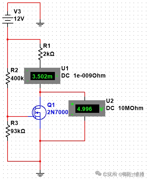 U G Q = 12 V ∗ R 3 / ( R 2 + R 3 ) = 2.26 V U_{GQ}=12V*R3/(R2+R3)=2.26V UGQ=12V∗R3/(R2+R3)=2.26V (1)