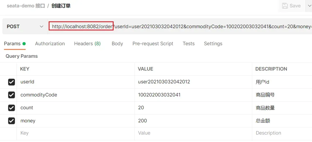 请求地址:http://localhost:8082/order?userId=user202103032042012&commodityCode=100202003032041&count=20&money=200