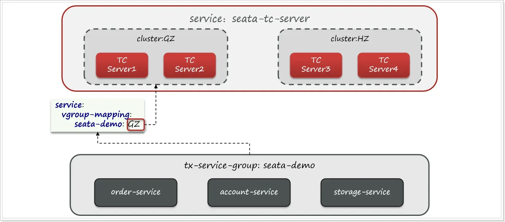 微服务基于事务组(tx-service-group)与TC集群的映射关系,来查找当前应该使用哪个TC集群。当GZ集群故障时,只需要将vgroup-mapping中的映射关系改成HZ。则所有微服务就会切换到HZ的TC集群了。