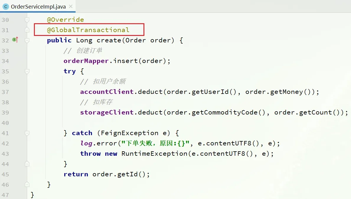 测试发现,当库存不足时,如果余额已经扣减,并不会回滚,出现了分布式事务问题。
