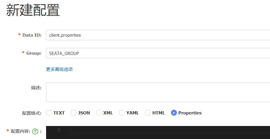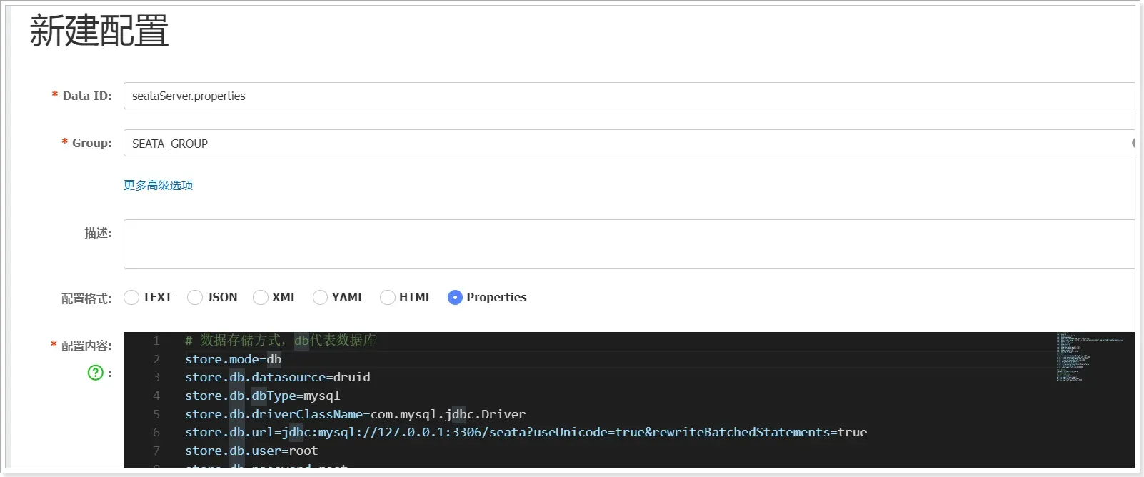 特别注意,为了让tc服务的集群可以共享配置,我们选择了nacos作为统一配置中心。因此服务端配置文件seataServer.properties文件需要在nacos中配好。格式如下: