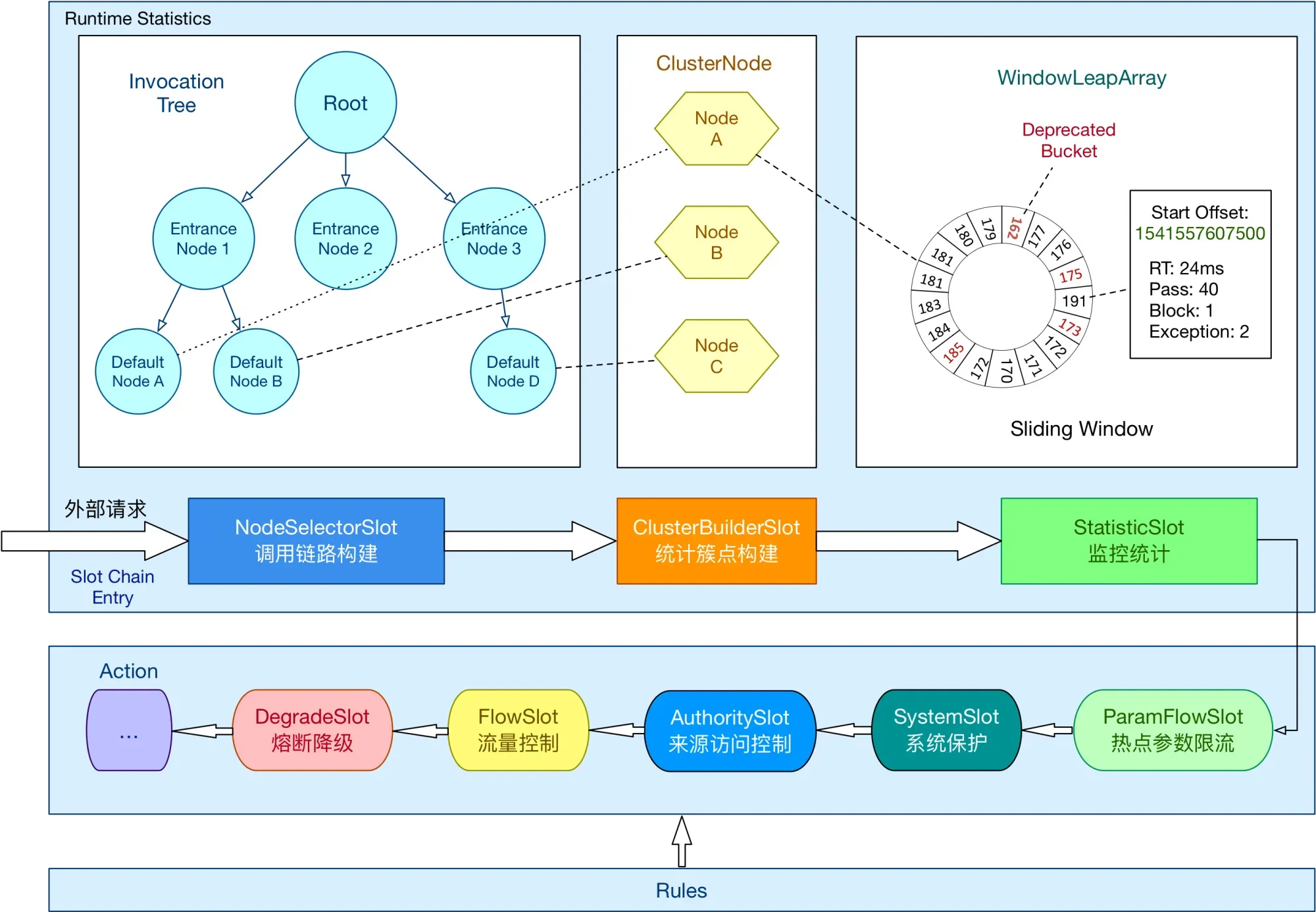 ●ClusterBuilderSlot 则用于存储资源的统计信息以及调用者信息,例如该资源的 RT, QPS, thread count 等等,这些信息将用作为多维度限流,降级的依据;
