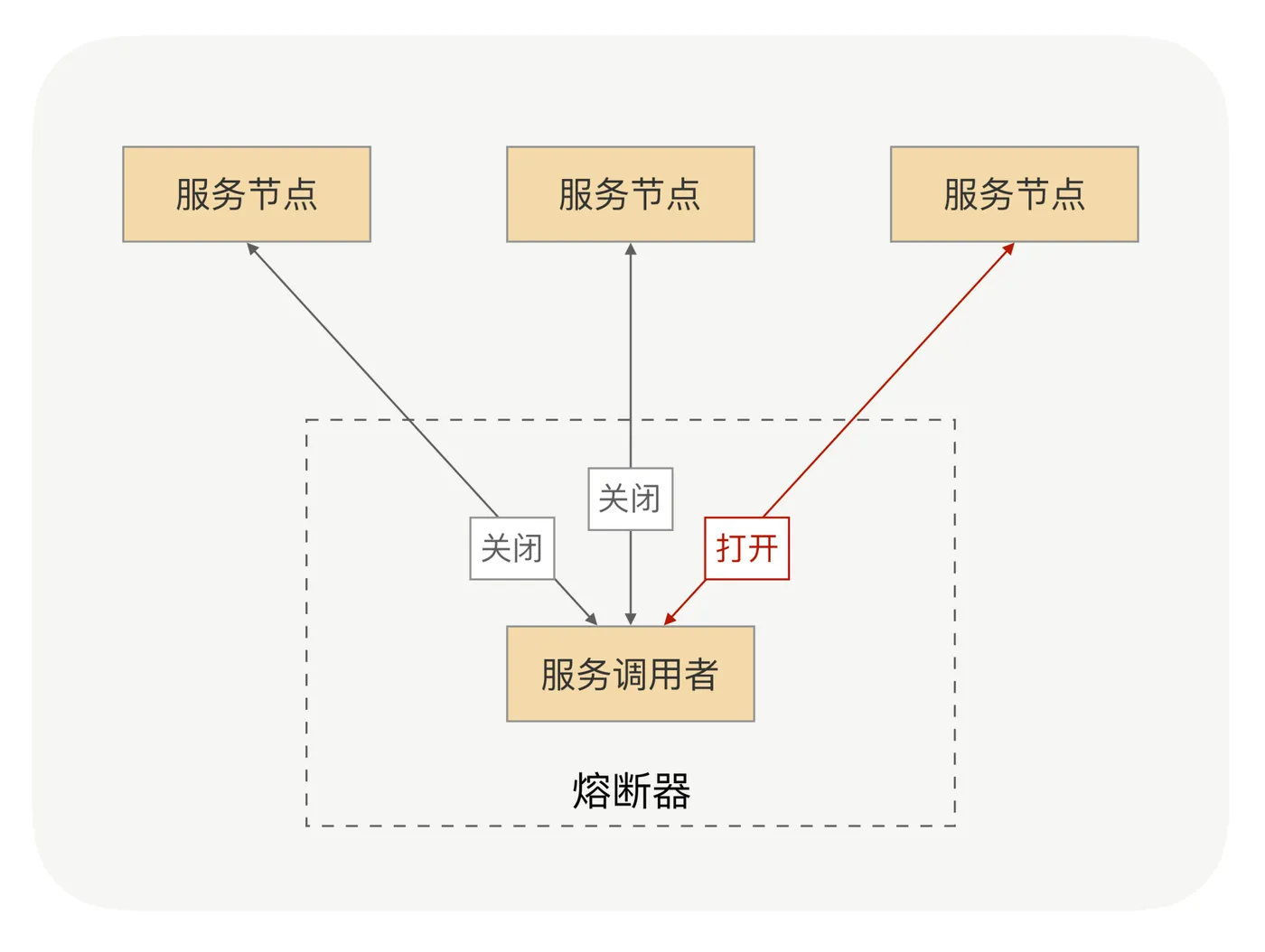 - 当调用端调用下游服务出现异常时,熔断器会收集异常指标信息进行计算,当达到熔断条件时熔断器打开,这时调用端再发起请求是会直接被熔断器拦截,并快速地执行失败逻辑;
