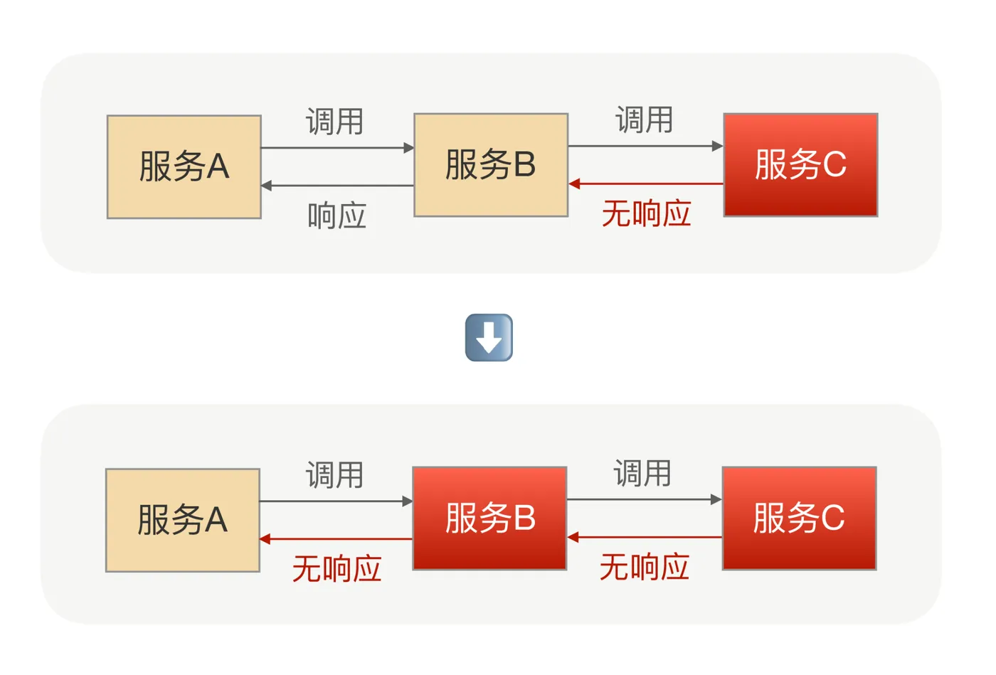 举个例子,假如我要发布一个服务 B,而服务 B 又依赖服务 C,当一个服务 A 来调用服务 B 时,服务 B 的业务逻辑调用服务 C,而这时服务 C 响应超时了,由于服务 B 依赖服务 C,C 超时直接导致 B 的业务逻辑一直等待,而这个时候服务 A 在频繁地调用服务 B,服务 B 就可能会因为堆积大量的请求而导致服务宕机。