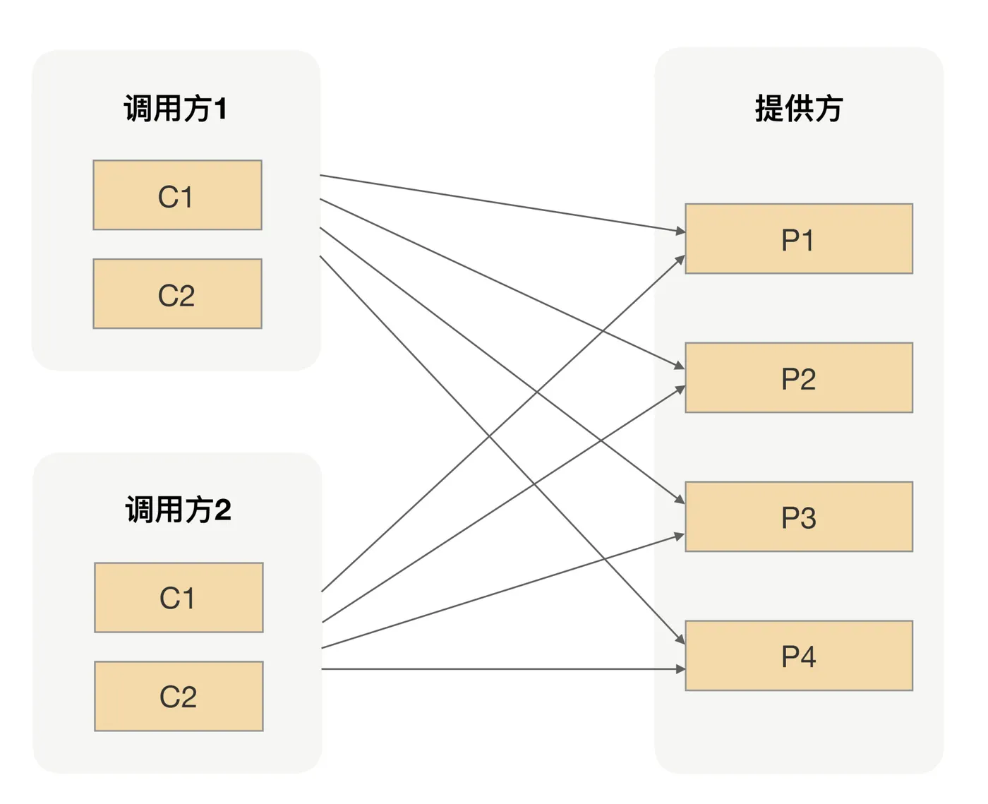 同样的道理,我们用在 RPC 治理上也是一样的。假设你是一个服务提供方应用的负责人,在早期业务量不大的情况下,应用之间的调用关系并不会复杂,请求量也不会很大,我们的应用有足够的能力扛住日常的所有流量。我们并不需要花太多的时间去治理调用请求过来的流量,我们通常会选择最简单的方法,就是把服务实例统一管理,把所有的请求都用一个共享的「大池子」来处理。这就类似于「简单道路时期」,服务调用方跟服务提供方之间的调用拓扑如下图所示: