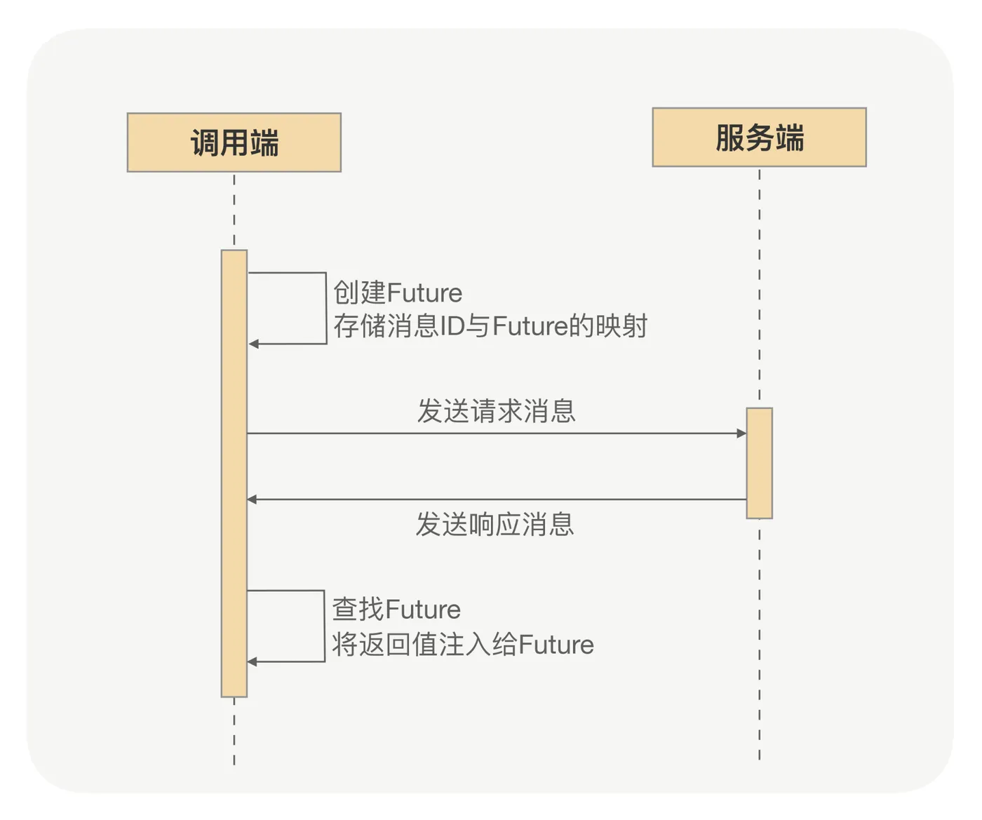 通过 第 02 讲 我们知道,调用端发送的每条消息都一个唯一的消息标识,实际上调用端向服务端发送请求消息之前会先创建一个 Future,并会存储这个消息标识与这个 Future 的映射,动态代理所获得的返回值最终就是从这个 Future 中获取的;当收到服务端响应的消息时,调用端会根据响应消息的唯一标识,通过之前存储的映射找到对应的 Future,将结果注入给那个 Future,再进行一系列的处理逻辑,最后动态代理从 Future 中获得到正确的返回值。