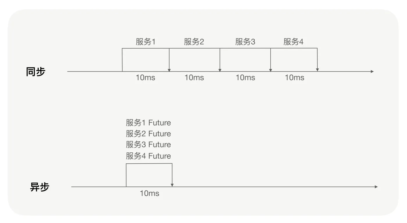 就比如刚才我提到的业务团队的那个问题,他们的业务逻辑中调用了好几个其它的服务,这时如果是同步调用,假设调用了 4 个服务,每个服务耗时 10 毫秒,那么业务逻辑执行完至少要耗时 40 毫秒。