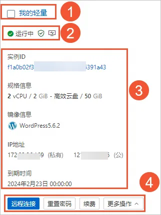 若服务器通过「应用镜像」创建(如 WordPress、LNMP),可通过「应用详情」快速管理: