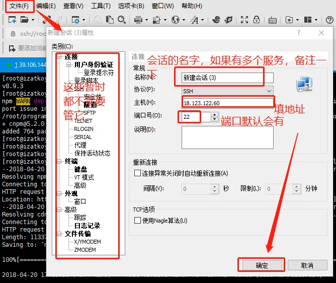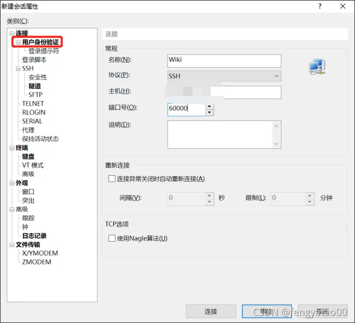 - 打开 Xshell,点击「新建会话」,输入「主机」(服务器公网 IP),端口默认「22」(SSH 端口);