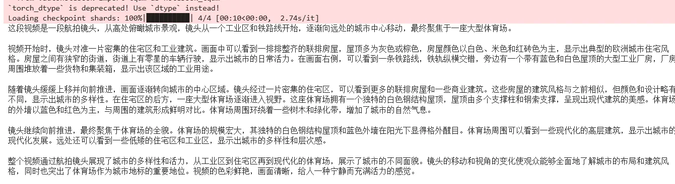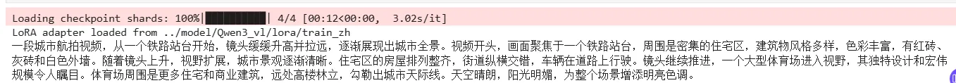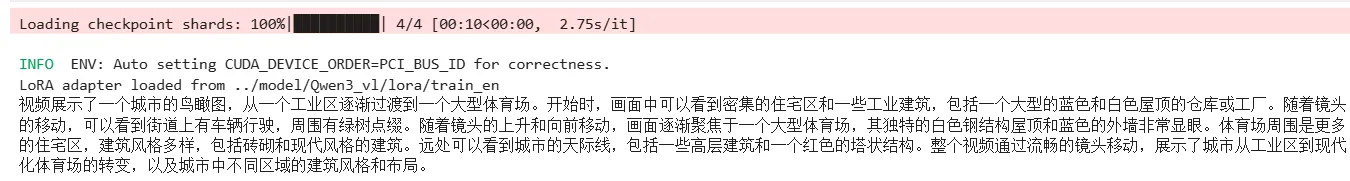 微调后的模型视频数据输出样本达到『场景正确 + 细节丰富 + 与真实标签语义一致』的可用标准,证明垂类微调已经成功把通用模型驯化成城市风光领域的专业描述员。