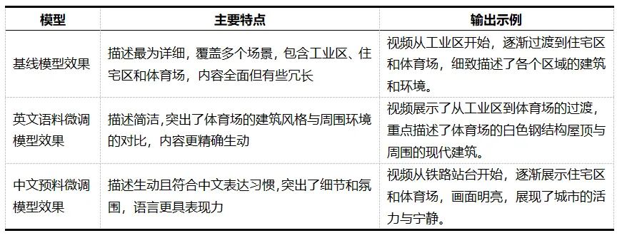 可以看出,基线模型提供了最为详细的场景描述,而英文微调模型则更加简洁且精准,中文微调模型则结合了中文表达习惯,提供了生动且富有氛围的描述。
