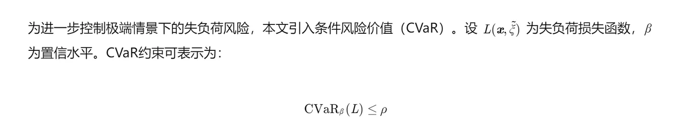 其中 ρ 为可接受的最大条件风险价值。该约束同样可以通过线性化方法转化为一组线性约束,从而将极端风险以可控的方式纳入优化模型。
