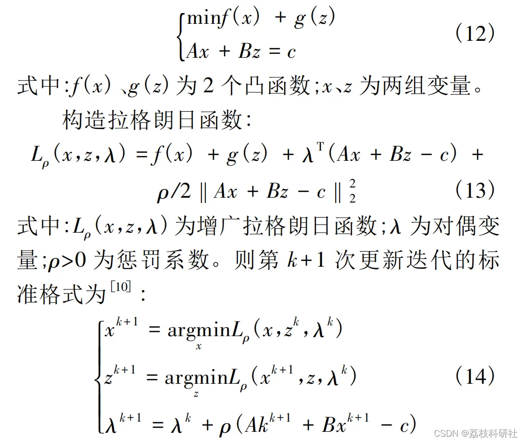 分解成若干个小问题,交替迭代进行求解,使原目标与其对偶变量共同收敛。其 标 准 形 式 如