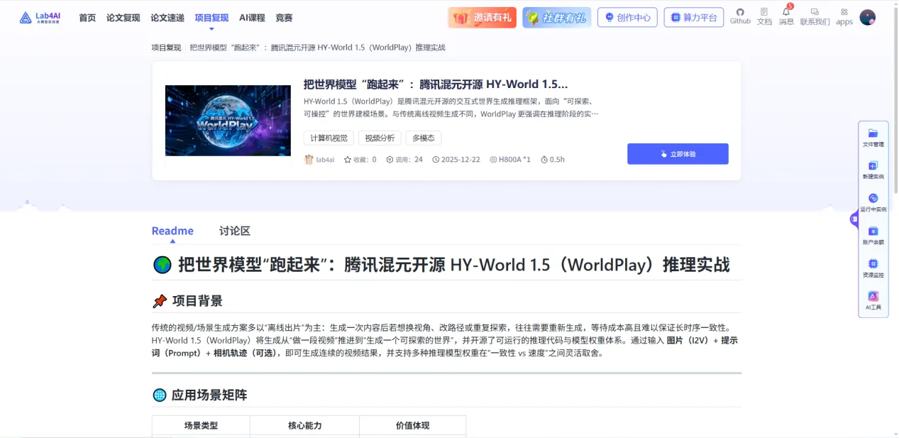 在Lab4AI平台上,搜索腾讯混元世界模型1.5,即可找到项目。