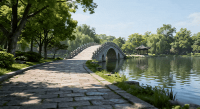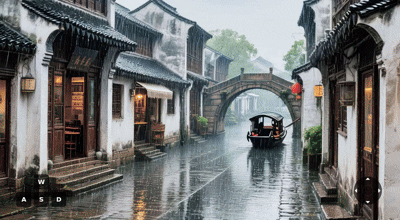 提示词:春雨连绵的江南水乡,青石板路被雨水打湿反光,白墙黑瓦的民居错落有致,河道上漂浮着乌篷船,岸边茶馆传来评弹声。