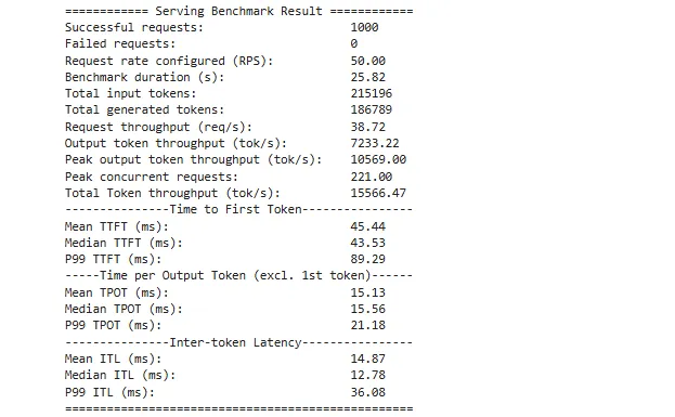 TPOT 上升到 38.75 ms/token,换算约 25 token/s。即便在千级并发的极限压力下,输出仍然是连续可读的,体验仍处在可用区间。