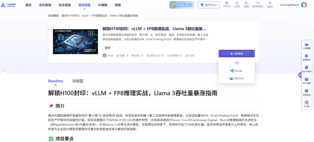 在Lab4AI 平台中搜索或点击对应项目解锁H100封印,点击立即体验,只需1卡即可体验。
