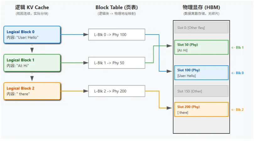 vLLM 的PagedAttention用虚拟内存和分页思想管理KV Cache:把每个请求的KV 拆成固定大小的 KV Blocks,并通过 Block Table 记录“逻辑连续的 token 块”到“物理显存块”的映射关系,使 KV Cache 可以按需分配、物理不连续存放,从而显著降低碎片化与无效占用,为高并发场景腾出显存空间。