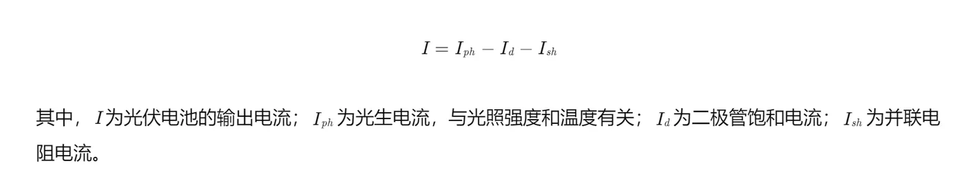单二极管模型的光伏电池等效电路由一个电流源、一个二极管、一个串联电阻和一个并联电阻组成。根据基尔霍夫电流定律和电压定律,可以得到光伏电池的输出电流方程为: