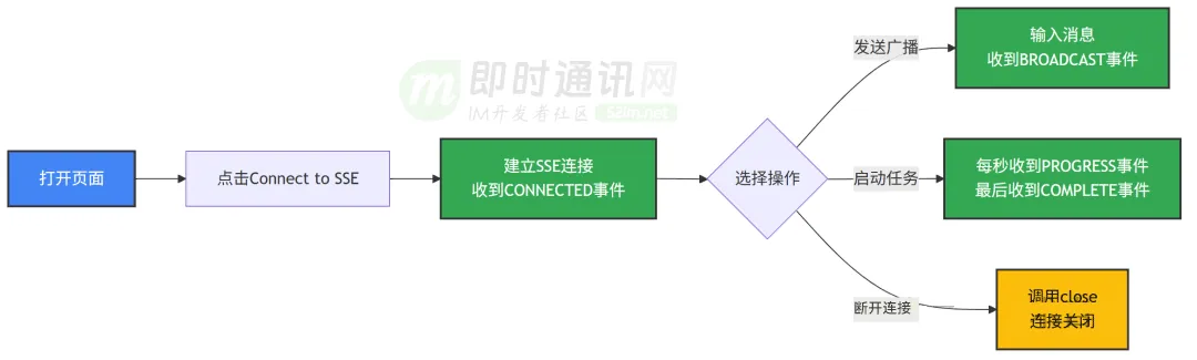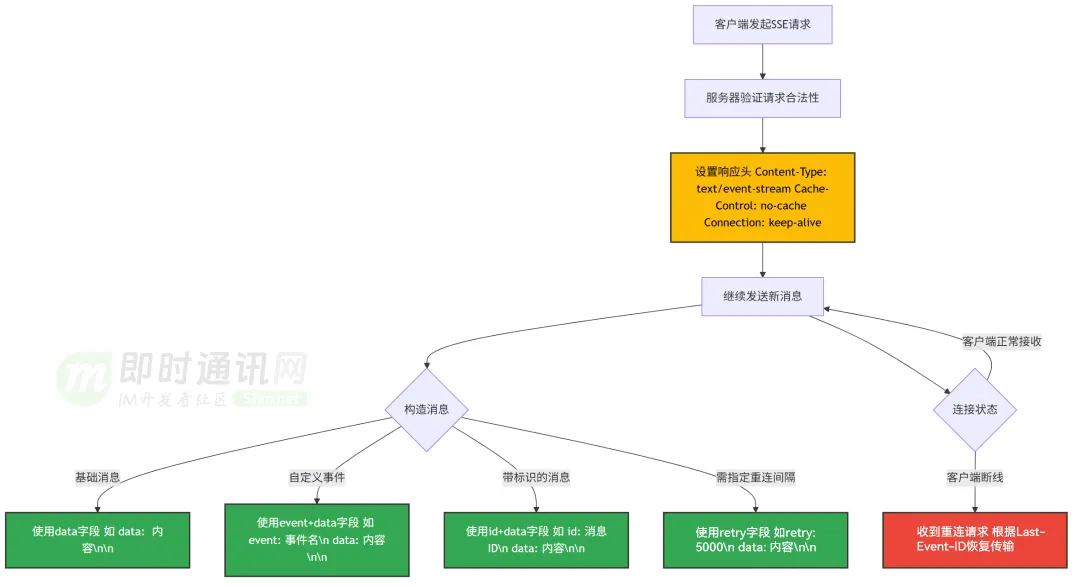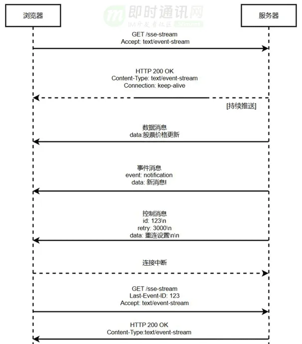 - 1)连接初始化:客户端使用特定的 Content-Type: text/event-stream 向服务器发起一个普通的 HTTP GET 请求。服务器确认并保持连接开放。