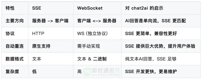 虽然 SSE 是主流选择,但在 chat2ai 应用变得非常复杂时,WebSocket 可能会成为更好的选择。