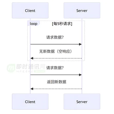 原理:用短连接请求数据。客户端以固定的时间间隔(例如每秒一次)频繁地向服务器发送请求,询问是否有新数据。