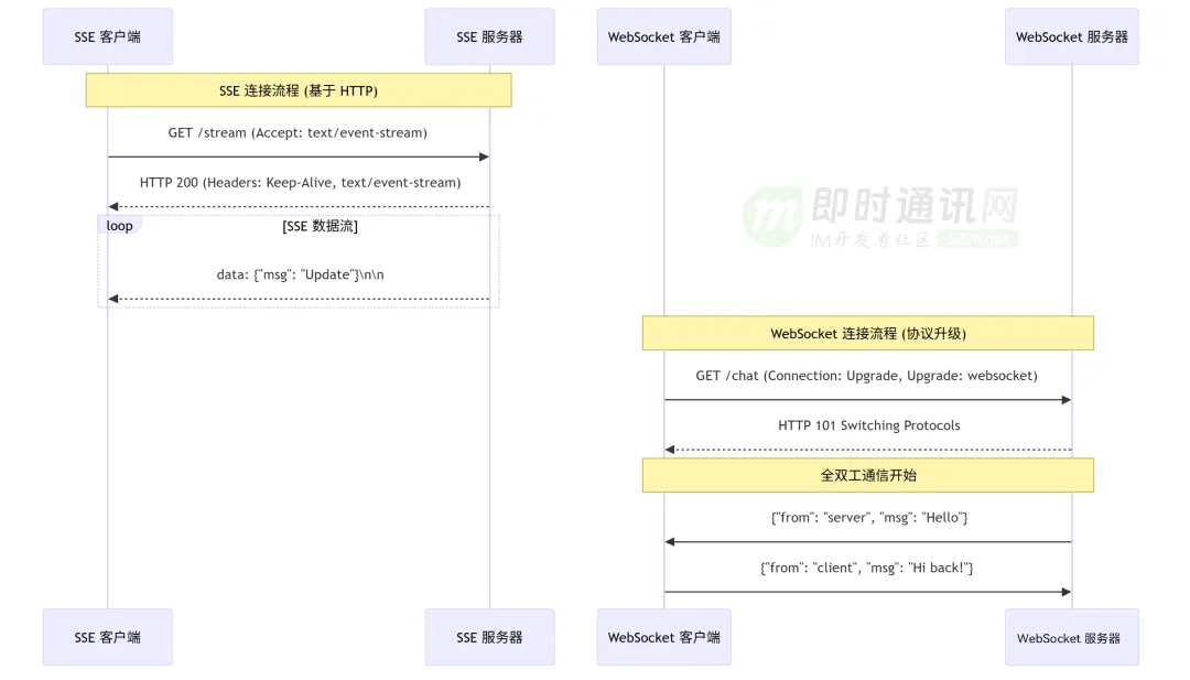 正如上图所示:SSE 方案在实现上更加直接和高效,因为它基于 HTTP,并且专门为服务器到客户端的单向数据流设计。