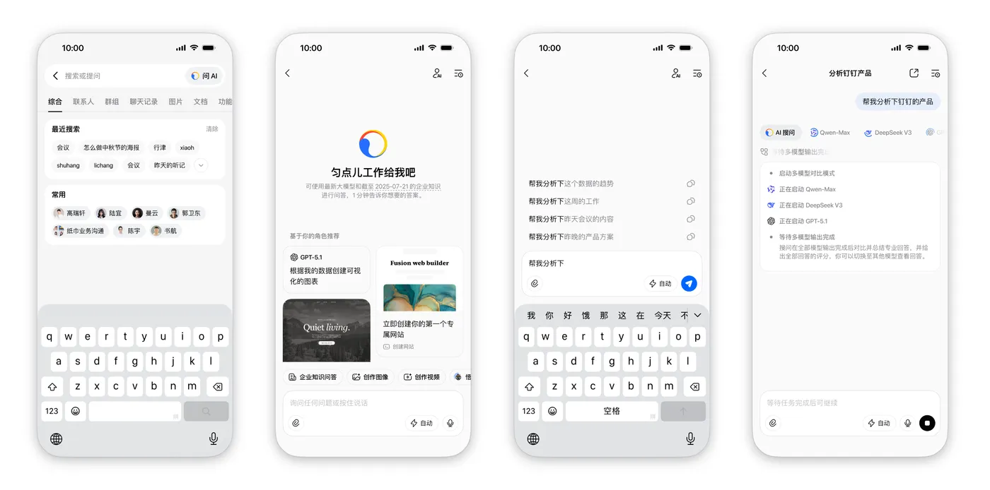 在全新AI钉钉1.1版本中,AI搜问、AI表格、DingTalk A1、AI听记四款广受好评的产品持续升级。