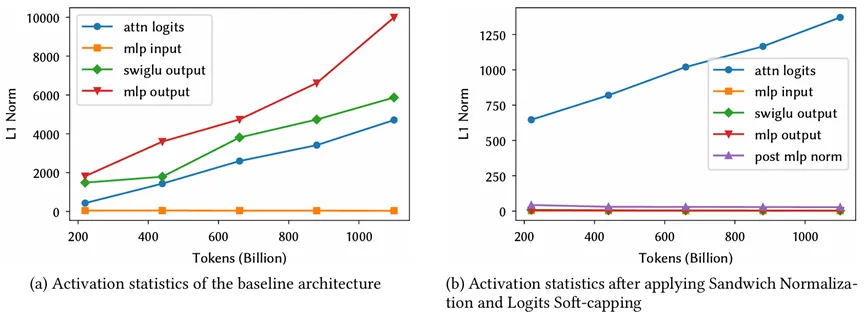 (b): 引入三明治范数与 Logits 软裁剪前后,模型激活值统计的对比结果。
