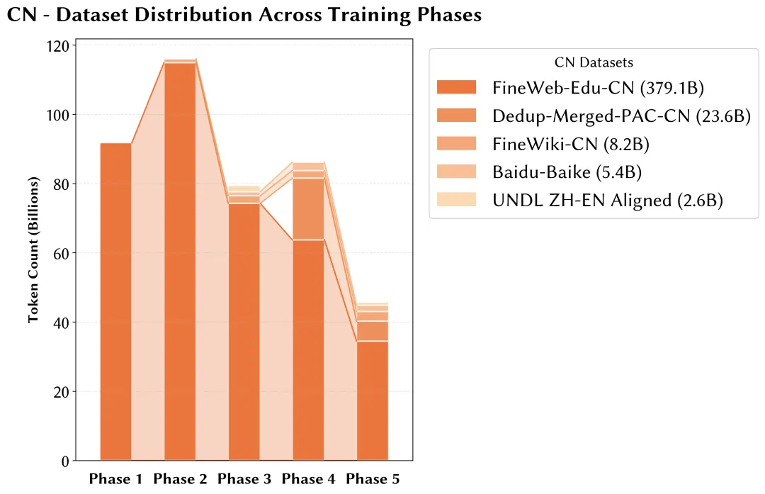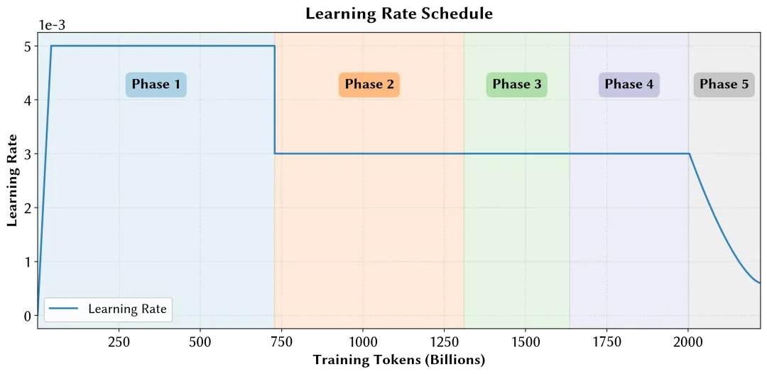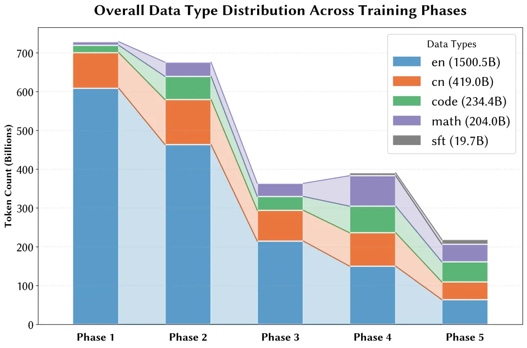 随着训练推进,逐步提升数学、代码、中文等领域数据的比例,缓解模型遗忘,使关键领域在训练后期得到充分学习。