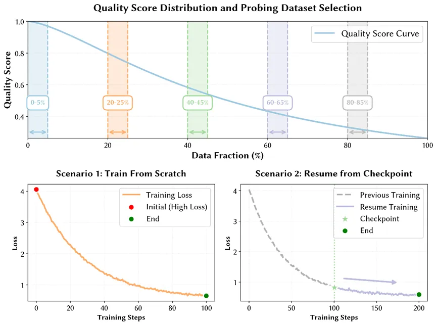 为解决数据集之间质量标签不可比的问题,团队提出分位标定:通过设计小规模探针实验,构建数据质量分数与下游任务表现之间的映射关系。