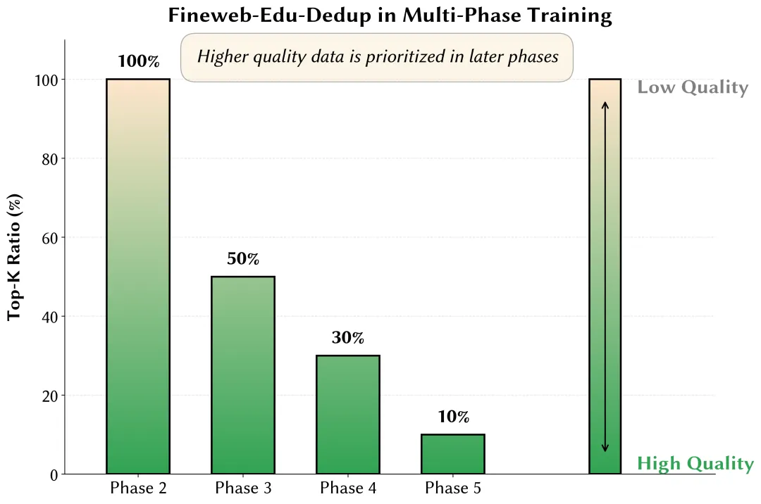 小规模实验表明,对高质量数据进行适度重复训练,效果优于单轮训练。开元‑2B 在训练后期逐步提高高质量数据的重复比例。