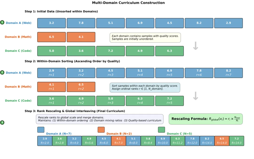 该方法通过领域内质量排序与领域间比例均衡的结合,实现多领域数据的渐进式学习。
