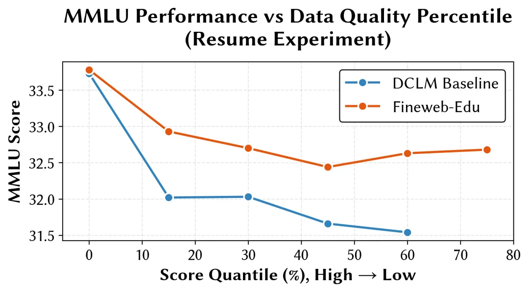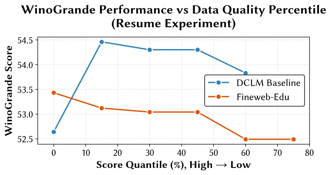 > [DCLM Baseline 和 Fineweb-Edu 在 MMLU 和 WinoGrande 上的分位标定结果]