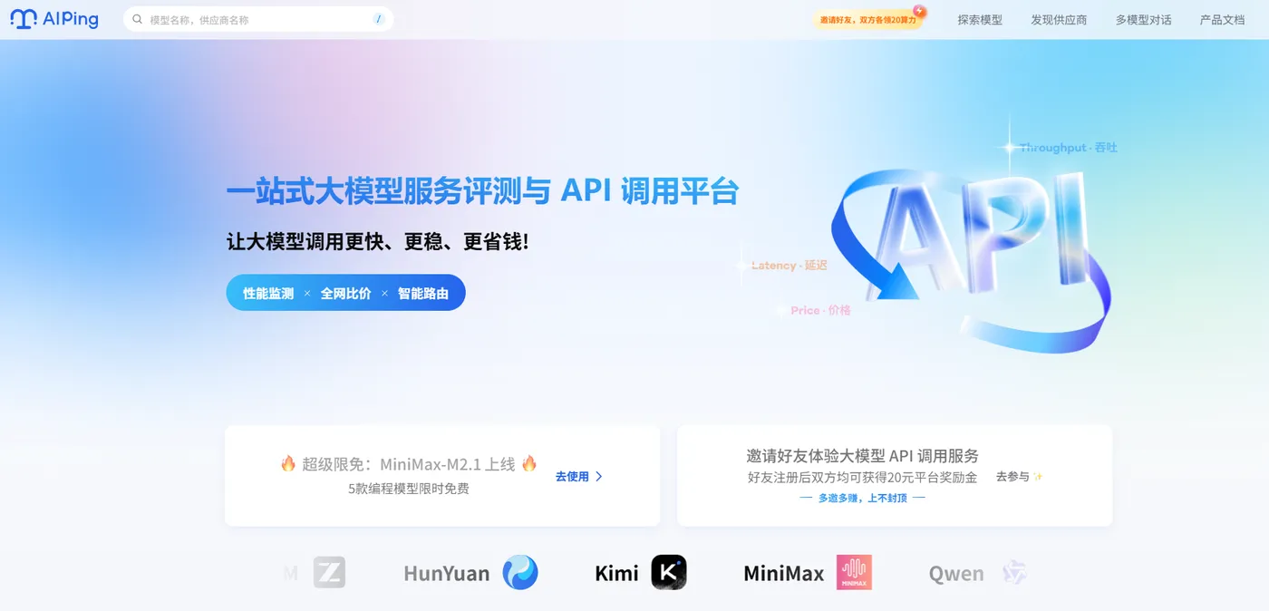 AI Ping 是一个提供多模型统一调用接口的开放平台,支持包括 GLM、MiniMax、通义、百川等在内的多个国产模型。其最大优势在于兼容 OpenAI 协议,这意味着开发者无需学习新 API,即可直接使用现有工具链。