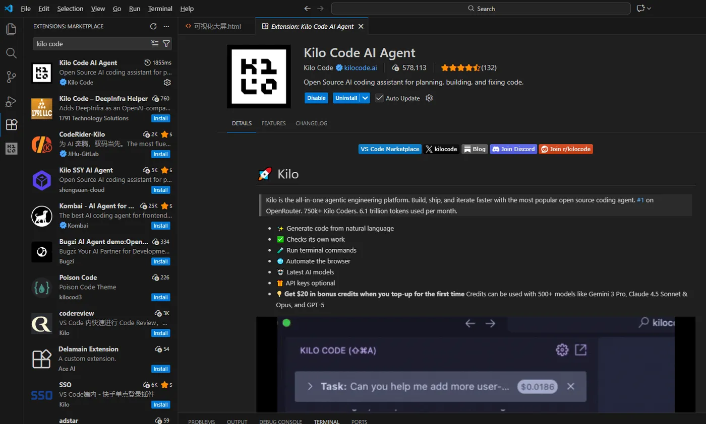 - 在 VS Code 扩展商店搜索 “Kilo Code”;