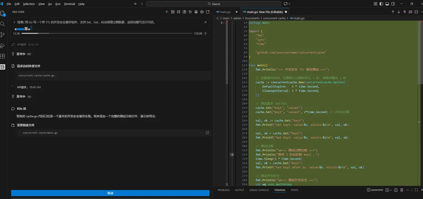 切换至 minimax-m2.1 模型后,Kilo Code 生成 concurrent-cache/cache.go 和对应的单元测试文件。