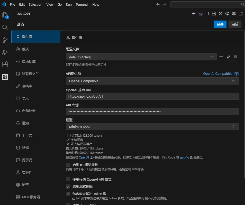 验证模型在系统编程**语言**(如 Go)中的代码生成质量,以下为MiniMax M2.1 模型配置。