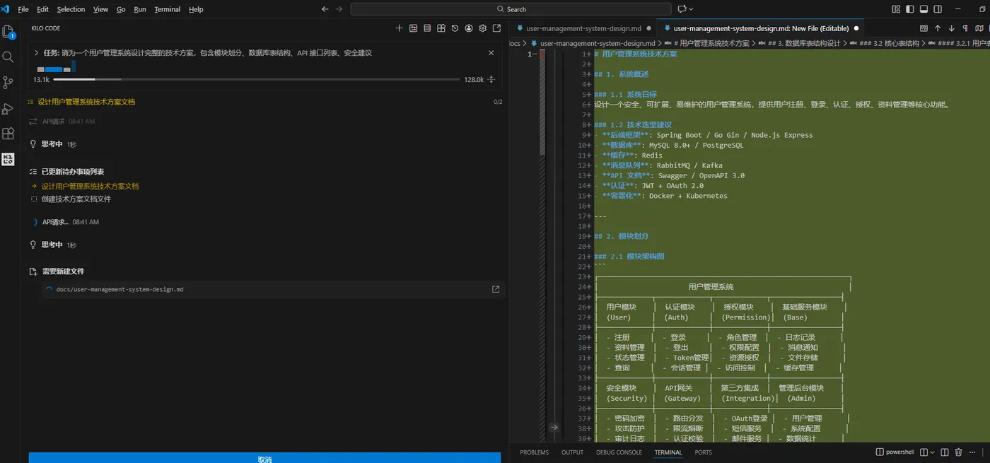 选择 glm-4.7 模型后,Kilo Code 自动创建 docs/ 目录,并生成多个文件,包括系统概述、API 设计、数据库脚本等。
