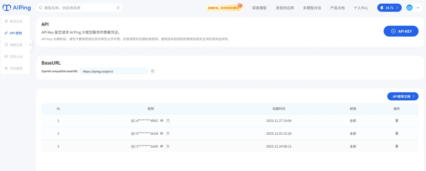 https://api.aiping.cn/v1 - API Key:形如 "QC-***********" 的密钥