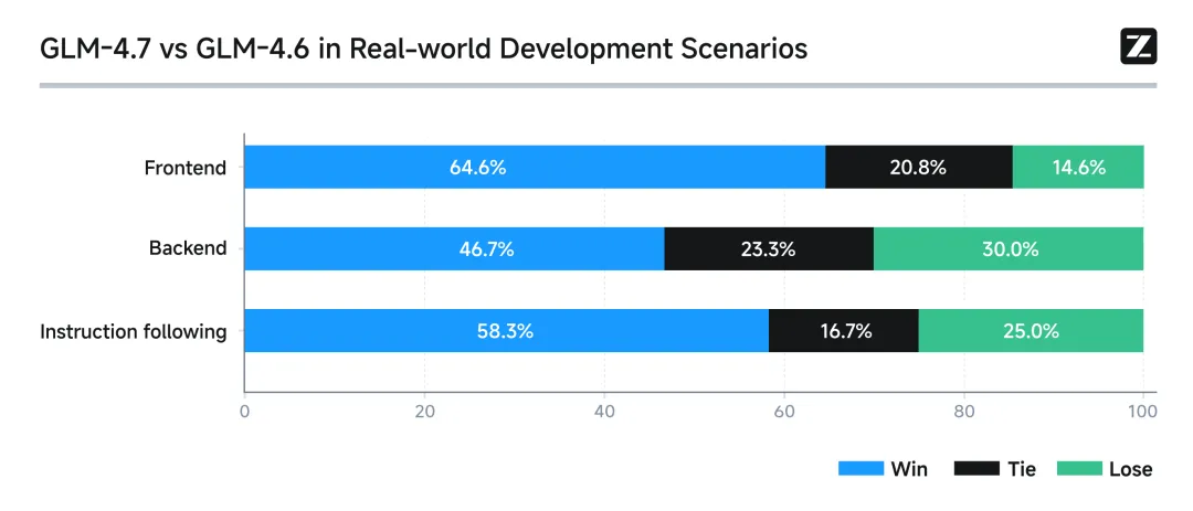 在Claude Code环境中,我们对100个真实编程任务进行了测试,覆盖前端、后端与指令遵循等核心能力。结果显示,GLM-4.7相较GLM-4.6在稳定性与可交付性上均有明显提升。