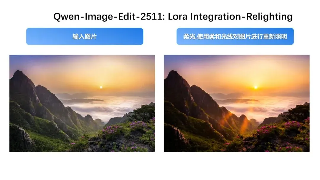 Qwen-Image-Edit自从发布以来,社区涌现了很多优秀的Lora创作者,他们给Qwen-Image-Edit注入了无限的想象空间。Qwen-Image-Edit-2511集成了这些Lora,因此基础模型本身就具备一些Lora效果,例如打光的Lora效果可以在基础模型中展现: