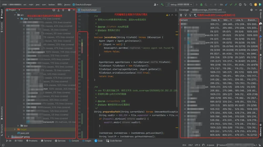 4. 覆盖率计算:覆盖率包含行、分支、类覆盖等,依赖代码.class文件和dump的采集数据,输出xml覆盖报告;